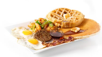 2 Eggs your way, 2 pieces of meat, home fries, and white toast.All waffles, pancakes, French toast are served with powdered sugar and butter, and 2 syrup cups
