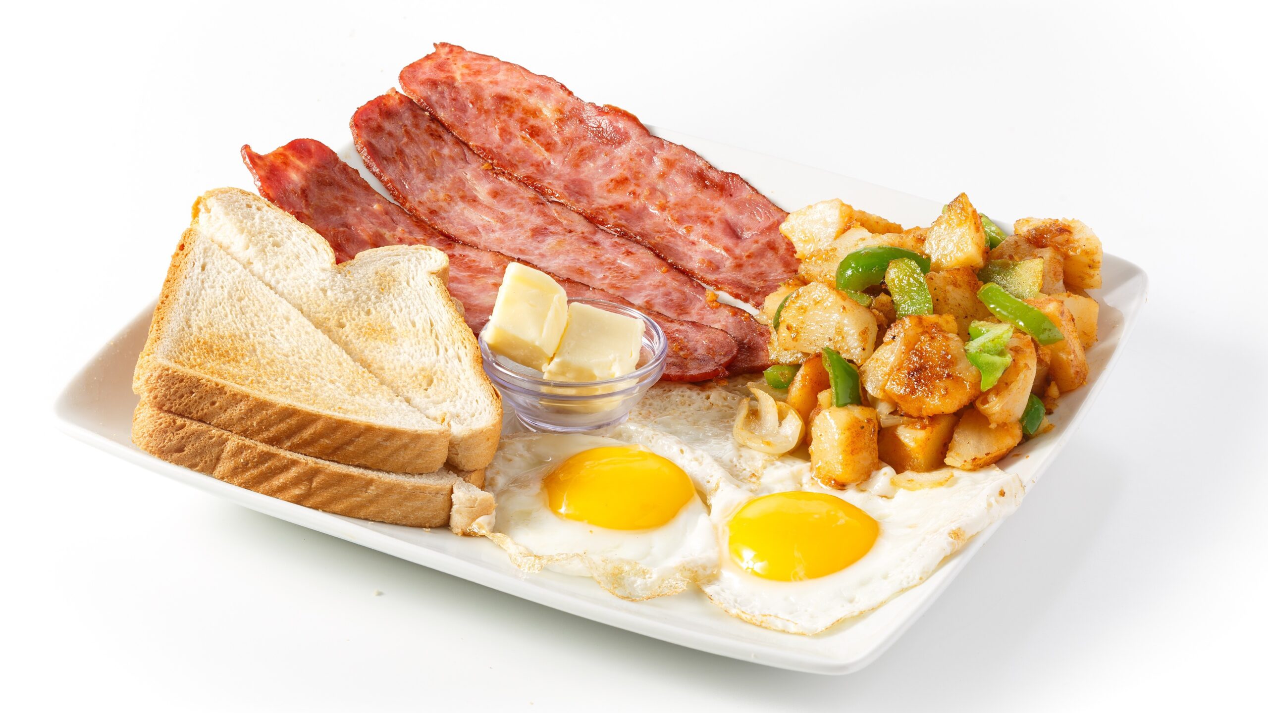2 Eggs your way, 2 pieces of meat, home fries, and white toast.