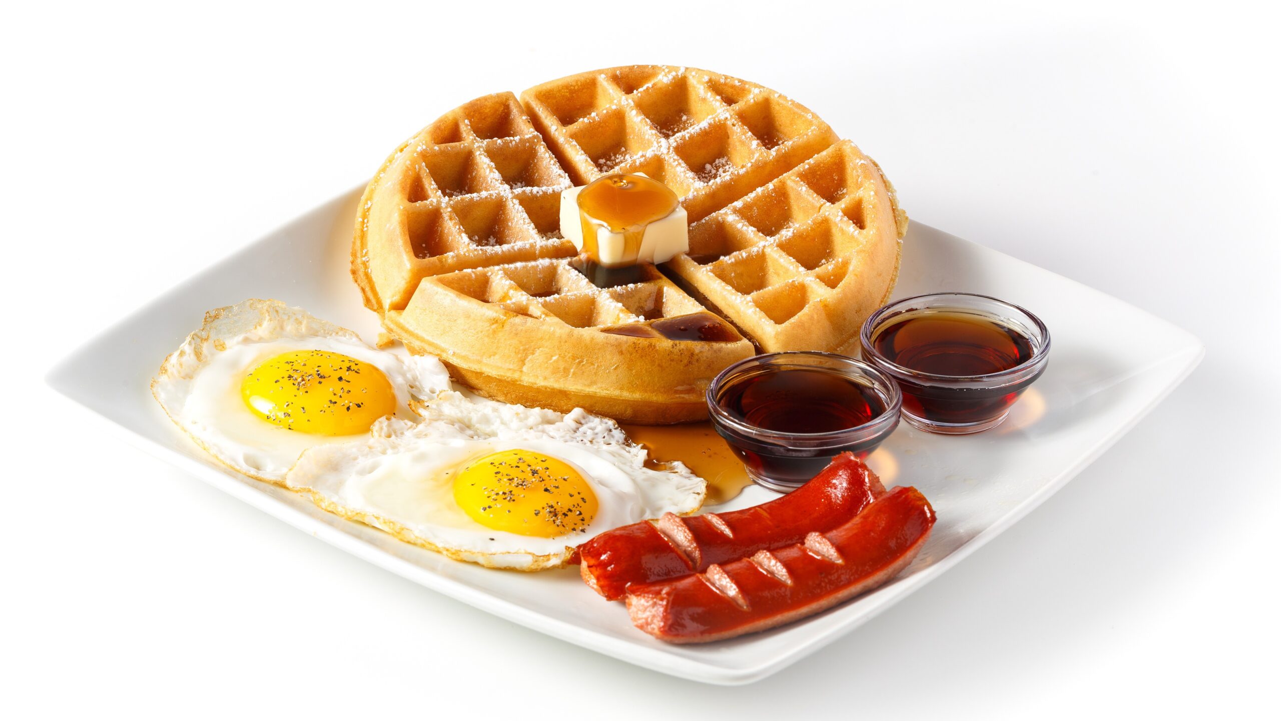 All waffles, pancakes, French toast are served with powdered sugar and butter, and 2 syrup cups